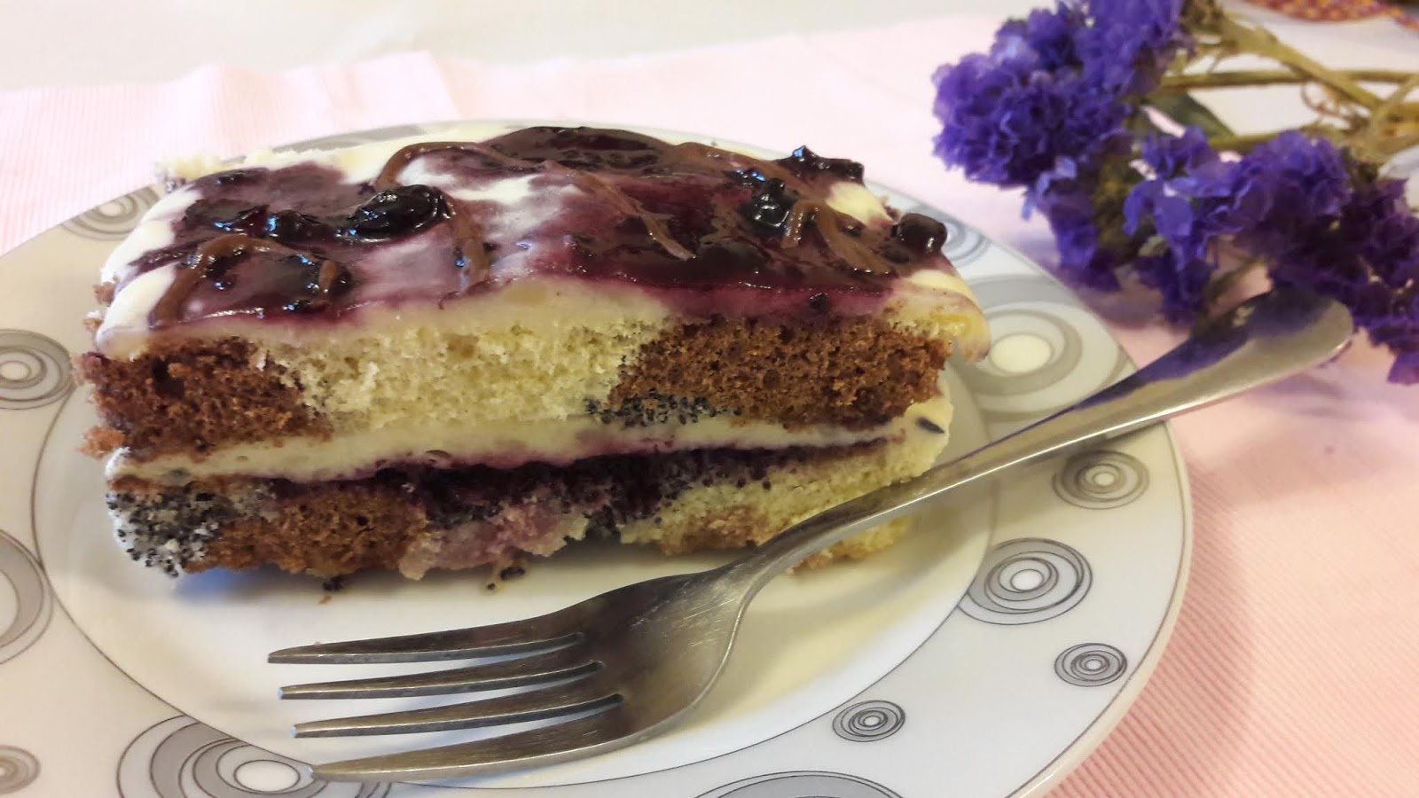 - Biszkopt dzielę na dwa płaty; pierwszy z nich nasączam wodą z cytryną, następnie smaruję dżemem porzeczkowym i wykładam połowę kremu; przykrywam drugim biszkoptem nasączonym wodą z cytryną i wykładam resztę kremu budyniowego i smaruję wierzch dżemem porzeczkowym oraz roztopioną mleczną czekoladą.